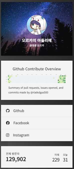얼마 전에 프라치노의 공간이라는 Tistory 유료 테마를 적용했다. 그래서 블로그에 이것저것 다시 꾸미기 시작했는데, 그중 하나가 Github Contribute 위젯이다.