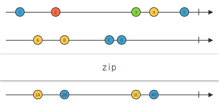 보이는 것처럼 타겟 Observable에 흘러온 데이터를 1:1로 대응해서 흘리는 Observable을 만듭니다. C, D 데이터가 들어오는 것을 보면 어느 한쪽에 쌍을 이룰 데이터가 들어오지 않으면 해당 다른 쪽 데이터를 보관하는 것을 알 수 있습니다. 거기에 한번 흘려진 데이터는 버려집니다.