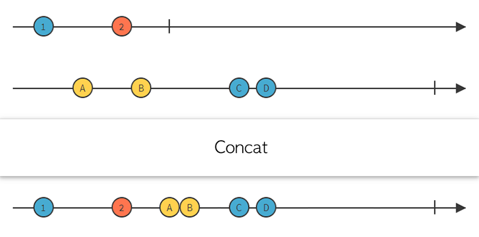 Array에서 Concat을 사용해보신 분이라면 익숙할 것입니다. 하나의 스트림이 끝나면 뒤에 추가한 스트림이 흐르기 시작합니다. 그림으로 보도록 하죠.