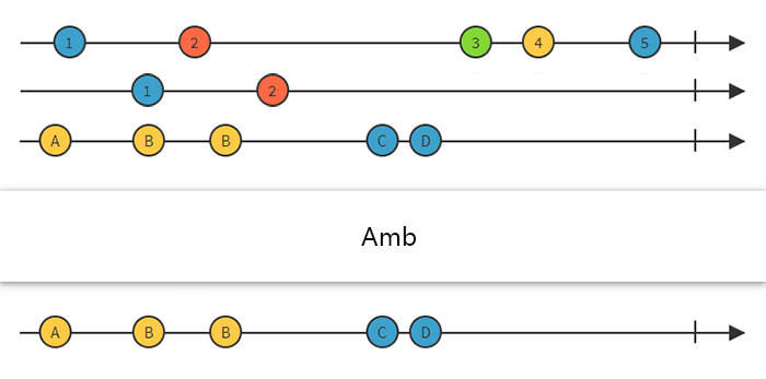 Amb는 N개의 Observable 중 가장 먼저 데이터가 흐른 Observable을 반환합니다. 그림을 보도록 하죠.